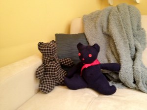 On the weekend, when I was in PA visiting my aunt, uncle and cousins, they gave me grandma and pappap bear. The bears are actually made with my pappap’s flannel shirt and one of my grandma’s turtlenecks. It is very touching – I can actually remember them in those tops and it is like having them with me.